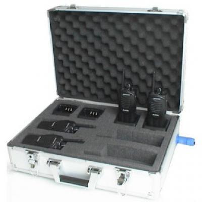 4 walkie-talkies (Kenwood TK-3201) in een koffer met geïntegreerde accu-opladers.